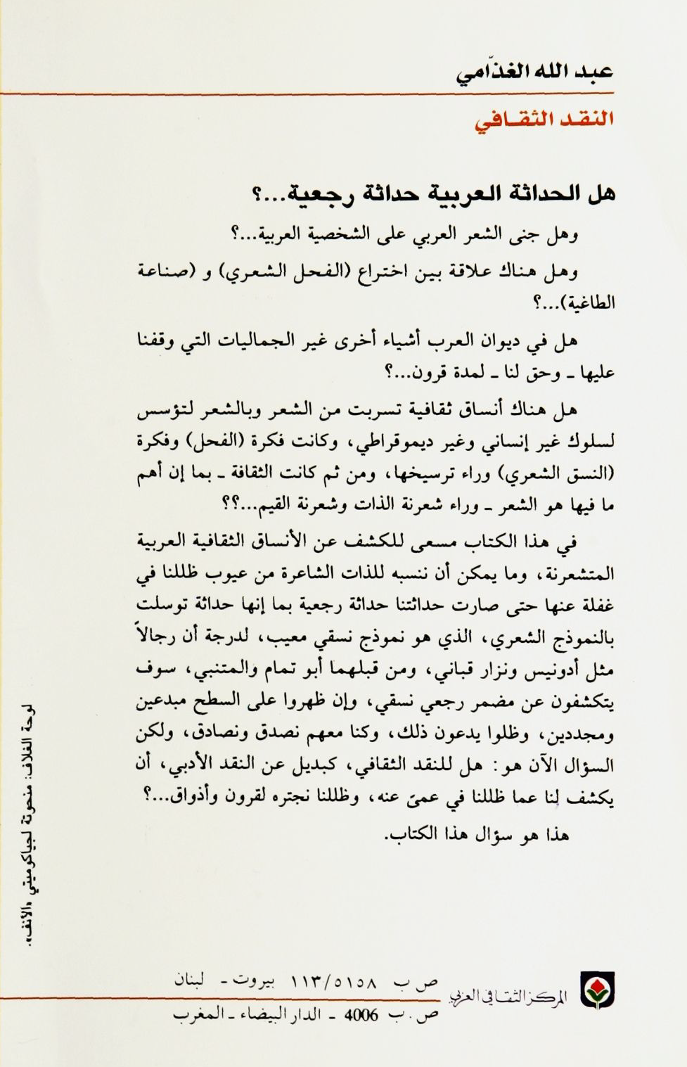 عبد الله الغذامي: النقد الثقافي.قراءة في أنساق الثقافة العربية